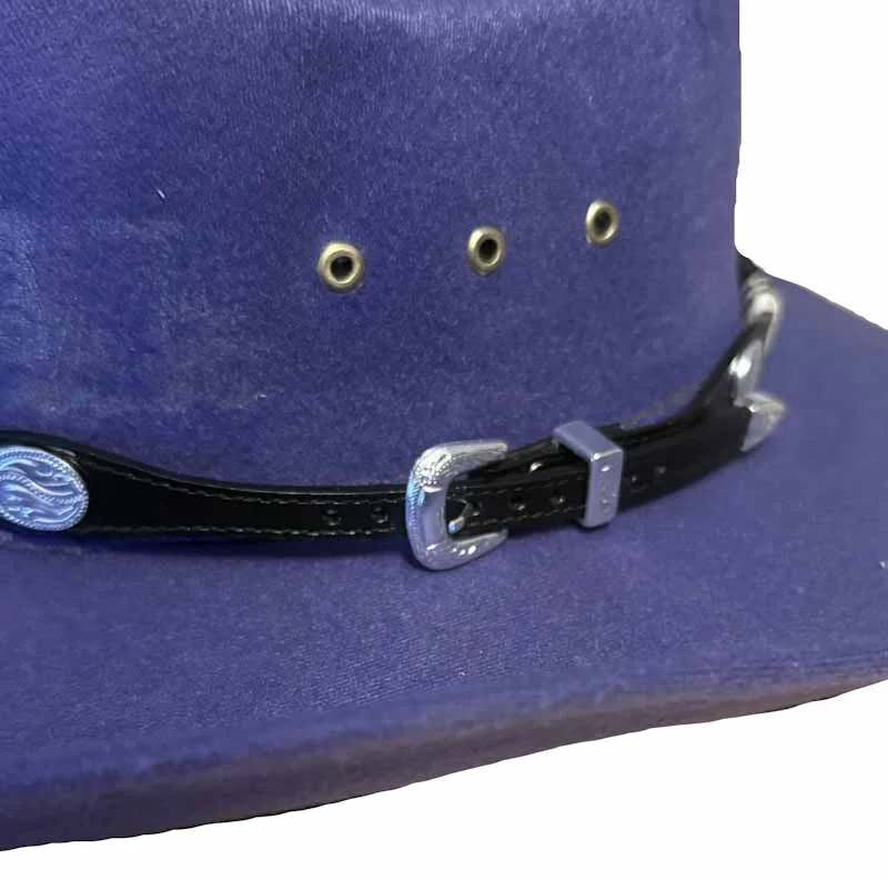 USA Made Black Leather Rawhide Silver Concho Hat Band for your Cowboy Hat with genuine rawhide accented and a silver belt buckle closure