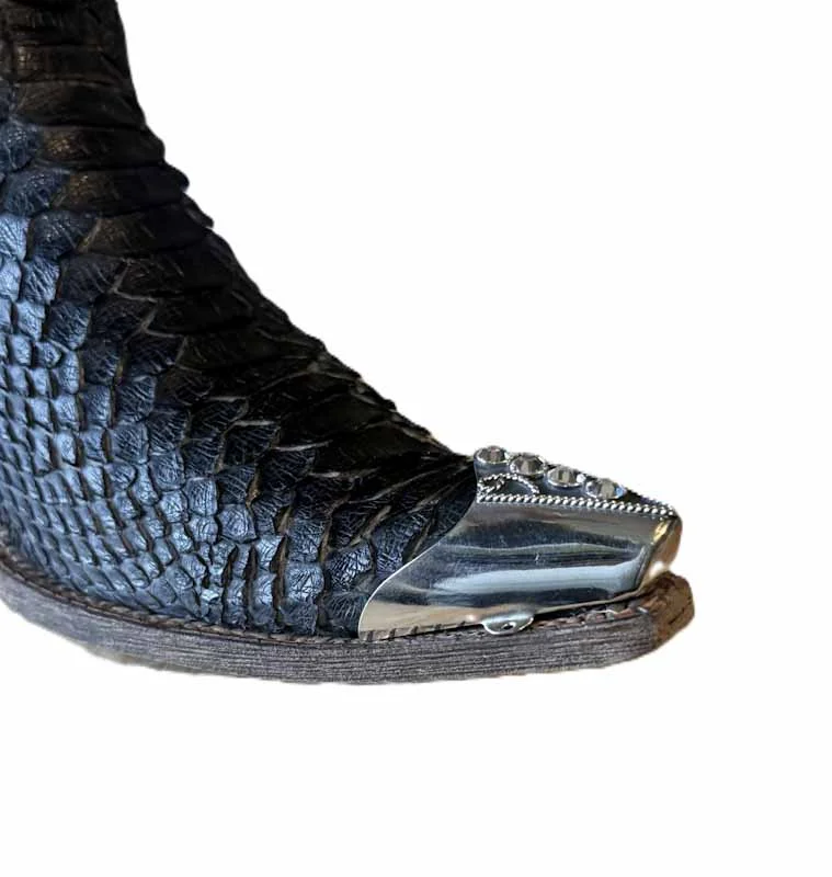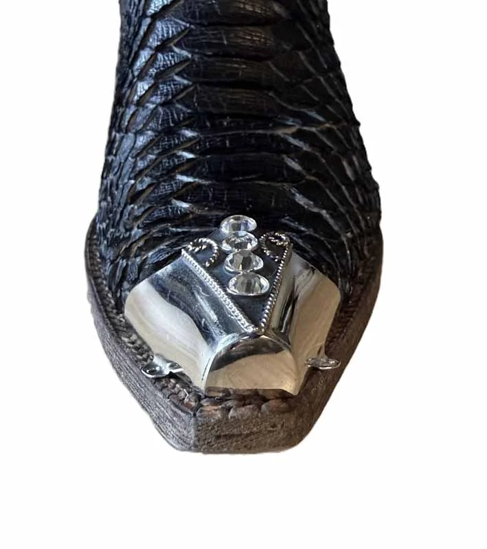 Two Toned Snip Toe style Rhinestone Bling Cowboy Boot Tips plated with sterling silver to protect your boots with a black under color and silver sides rhinestone toe rands.