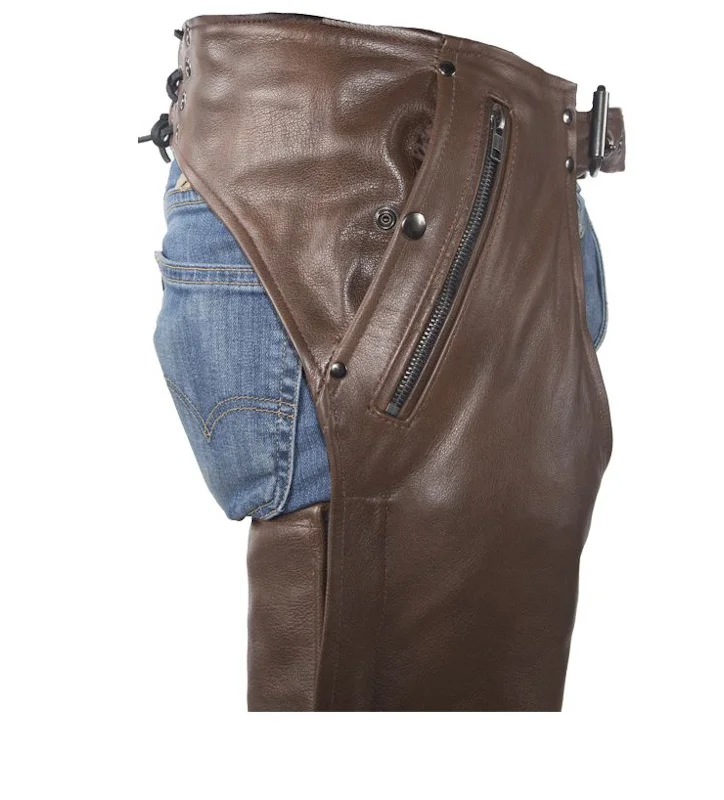 Men’s Brown Leather Zipper Pocket Chaps with removable inner liner for warmth fits 20-22″ thigh full zip covered side