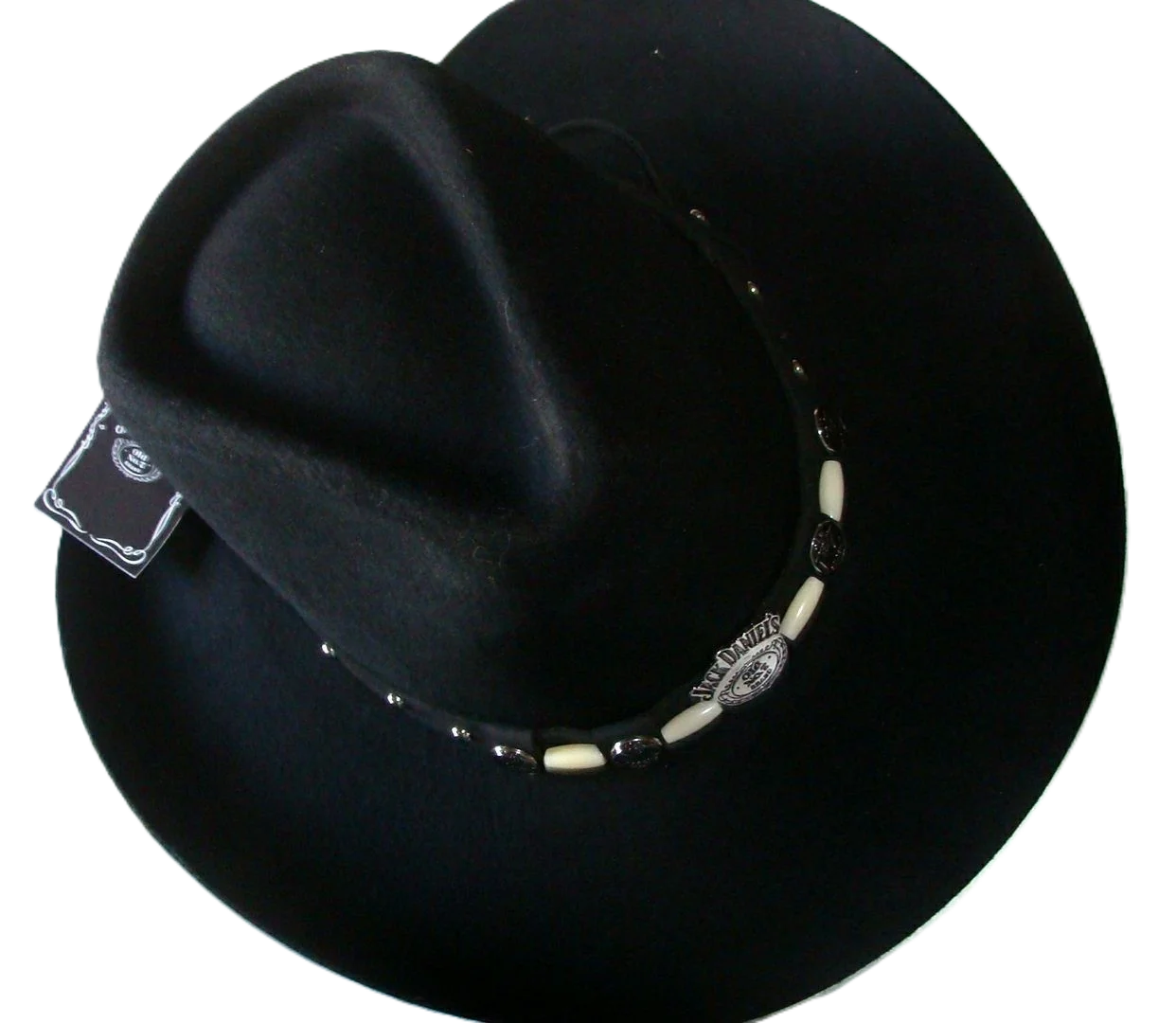 MADE IN THE USA. Easy care Black Wool Jack Daniel’s stylish Pinch front cowboy hat with faux buffalo bones and JD logo hat band. size small adult. Jack Daniels hat for men or women.