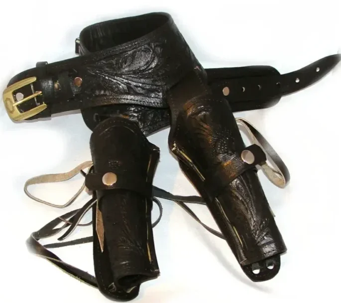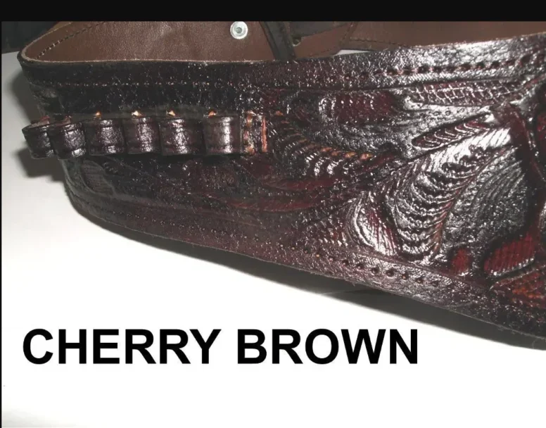 .22 /.38 /.45 Caliber for kids Black or Cherry Brown Double Gun holsters belt hand tooled with genuine leather, made in Mexico especially for kids with options of a .22, .38 or .45 caliber pistol size. A real leather gun belt or pistol holder made in the kids sizes for a toy gun or the real thing. There is no difference between this fine quality leather toy gun holster and the real one made for adults.