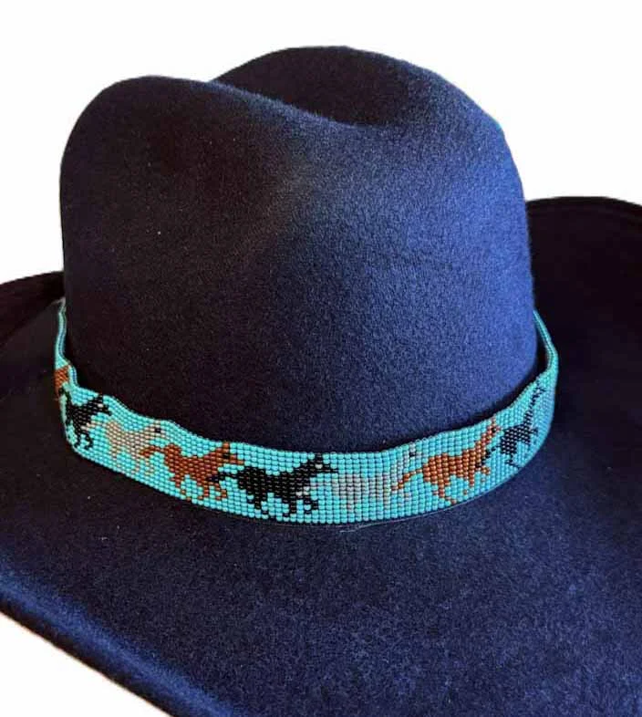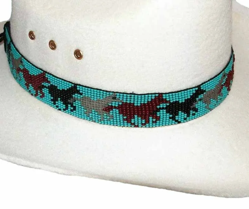 USA made Running Horses Turquoise Beaded Leather Tie Back Cowboy Hat Band detailed and hand beaded