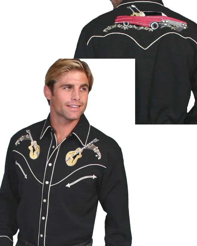 Scully Rockabilly Men’s Guitar western shirt in black with embroidered musical notes 50’s convertible Cadillac car retro pearl snaps & vintage piping.