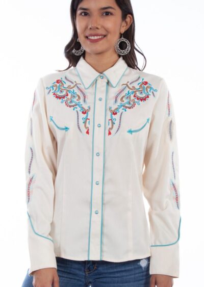 Scully Women’s Embroidered Feathers Cream Denim Western Shirt