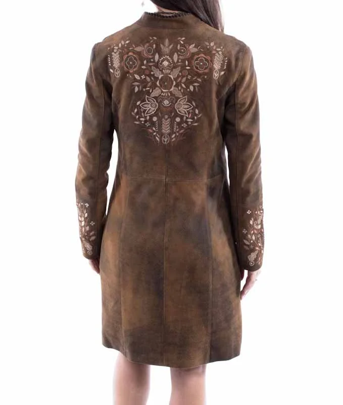 Scully Women’s Embroidered Brown Suede Coat country western style high whip stich collar, button front knee high length with floral leaf embroidery.