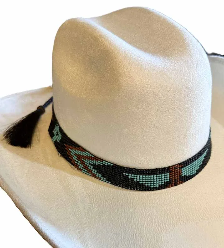 USA Made Black and Turquoise Firebird Beaded Cowboy Hat Band with Horse Hair Tassels back tie closure…. Cowboy hat not included, sold separate HERE; Silverton Crown Off White Vegan Suede Cowboy Hat