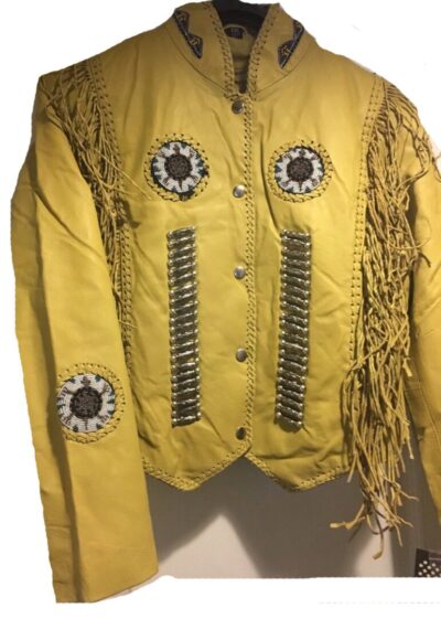 Womens Mustard Yellow leather Native Beaded Fringe Jacket